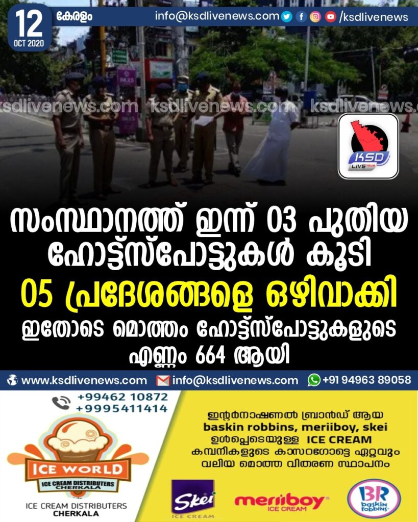 സംസ്ഥാനത്ത് ഇന്ന് 03 പുതിയ ഹോട്ട്സ്പോട്ടുകള് കൂടി; 05 പ്രദേശങ്ങളെ ഒഴിവാക്കി.ഇതോടെ മൊത്തം ഹോട്ട്സ്പോട്ടുകളുടെ എണ്ണം 664 ആയി.