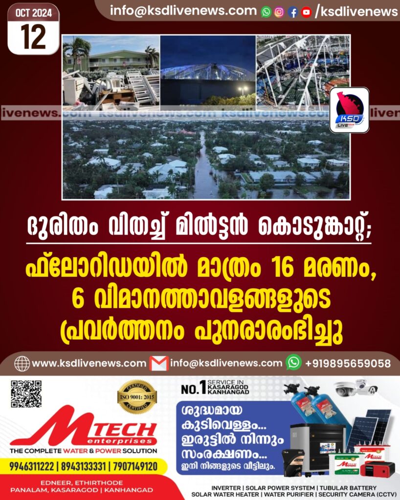 ദുരിതം വിതച്ച് മില്ട്ടൻ കൊടുങ്കാറ്റ്; ഫ്ലോറിഡയില് മാത്രം 16 മരണം, 6 വിമാനത്താവളങ്ങളുടെ പ്രവര്ത്തനം പുനരാരംഭിച്ചു