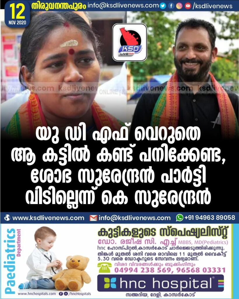 യു ഡി എഫ് വെറുതെ ആ കട്ടിൽ കണ്ട് പനിക്കേണ്ട , ശോഭ സുരേന്ദ്രൻ പാർട്ടി വിടില്ലെന്ന് കെ സുരേന്ദ്രൻ