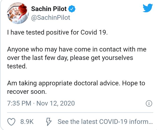 ജയ്പുർ: കോൺഗ്രസ് നേതാവ് സച്ചിൻ പൈലറ്റിന് കോവിഡ് 19 സ്ഥിരീകരിച്ചു. രോഗബാധിതനായ കാര്യം സച്ചിൻ തന്നെയാണ് ട്വിറ്ററിലൂടെ അറിയിച്ചത്. കഴിഞ്ഞ കുറച്ചുദിവസങ്ങളിൽ താനുമായി സമ്പർക്കം പുലർത്തിയവർ പരിശോധനയ്ക്ക് വിധേയരാകണമെന്നും സച്ചിൻ അഭ്യർഥിച്ചിട്ടുണ്ട്.