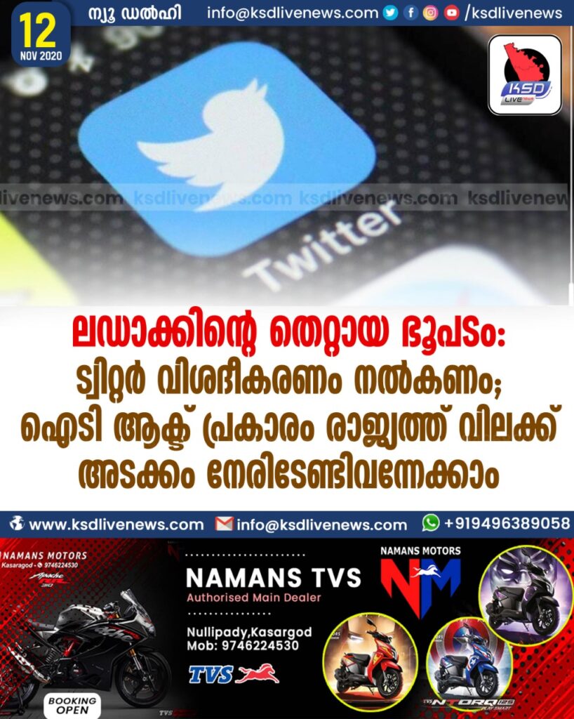 ന്യൂഡൽഹി: കേന്ദ്രഭരണ പ്രദേശമായ ലഡാക്കിനെ ജമ്മു കശ്മീരിന്റെ ഭാഗമായി ഭൂപടത്തിൽ കാണിച്ചത് സംബന്ധിച്ച് അഞ്ച് പ്രവൃത്തി ദിവസത്തിനകം വിശദീകരണം നൽകണമെന്ന് ട്വിറ്ററിനോട് കേന്ദ്ര സർക്കാർ. വിശദീകരണം തൃപ്തികരമല്ലെങ്കിൽ ഐ.ടി ആക്ട് പ്രകാരം രാജ്യത്ത് ട്വിറ്ററിന് വിലക്കേർപ്പെടുത്തുന്നത് അടക്കമുള്ള നടപടികൾ സ്വീകരിക്കാൻ സർക്കാരിന് കഴിയും. ആറുമാസം തടവുശിക്ഷ ലഭിക്കാവുന്ന വകുപ്പുകൾ ചേർത്ത് കേസെടുക്കാനും കഴിയുമെന്ന് എൻഡിടിവി റിപ്പോർട്ടു ചെയ്തു.