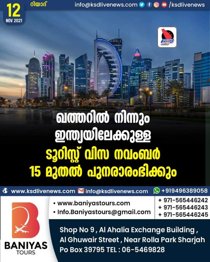 ഖത്തറില് നിന്നും ഇന്ത്യയിലേക്കുള്ള ടൂറിസ്റ്റ് വിസ നവംബര് 15 മുതല് പുനരാരംഭിക്കും
