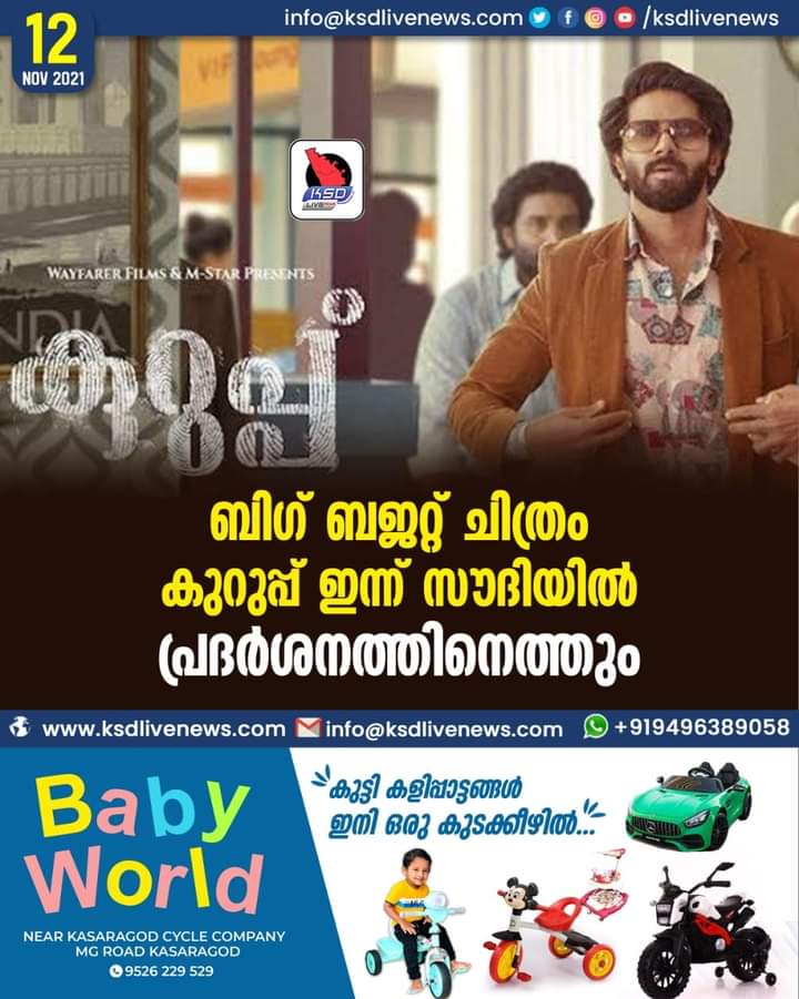 ബിഗ് ബജറ്റ് ചിത്രം കുറുപ്പ് ഇന്ന് സൗദിയിൽ പ്രദർശനത്തിനെത്തും.’കുറുപ്പി’നെ വരവേൽക്കാൻ സൗദിയിൽ ദുൽഖർ ആരാധകർ ഒരുങ്ങി കഴിഞ്ഞു. കുപ്രസിദ്ധ പിടികിട്ടാപുള്ളി സുകുമാര കുറുപ്പിെൻറ കഥ പറയുന്ന കോവിഡിെൻറ നിഴലകന്ന് രാജ്യം സാധാരണനിലയിലേക്ക് മടങ്ങുന്ന സാഹചര്യത്തിൽ സൗദിയിലെ തിയറ്ററുകളിൽ ഒരു വലിയ മലയാളം ചിത്രം പ്രദർശനത്തിന് എത്തുന്നത് പ്രവാസി ചലച്ചിത്രപ്രേമികളിൽ ഏറെ ആവേശം ജനിപ്പിച്ചിട്ടുണ്ട്. സുകുമാര കുറുപ്പ് സൗദിയിലുണ്ടെന്ന നിലയിൽ ധാരാളം വാർത്തകൾ മുമ്പ് പ്രചരിച്ചിരുന്നു. തന്നെ കുറിച്ചുള്ള സിനിമ കാണാൻ ഇനി സാക്ഷാൽ സുകുമാരക്കുറുപ്പ് തന്നെ തിയറ്ററിലെത്തുമോ