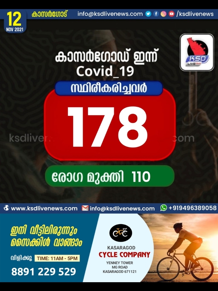 കാസർഗോഡ് ജില്ലയിൽ ഇന്ന് 178 പേർക്ക് കോവിഡ് സ്ഥിരീകരിച്ചു. 110 പേർക്ക് രോഗമുക്തി