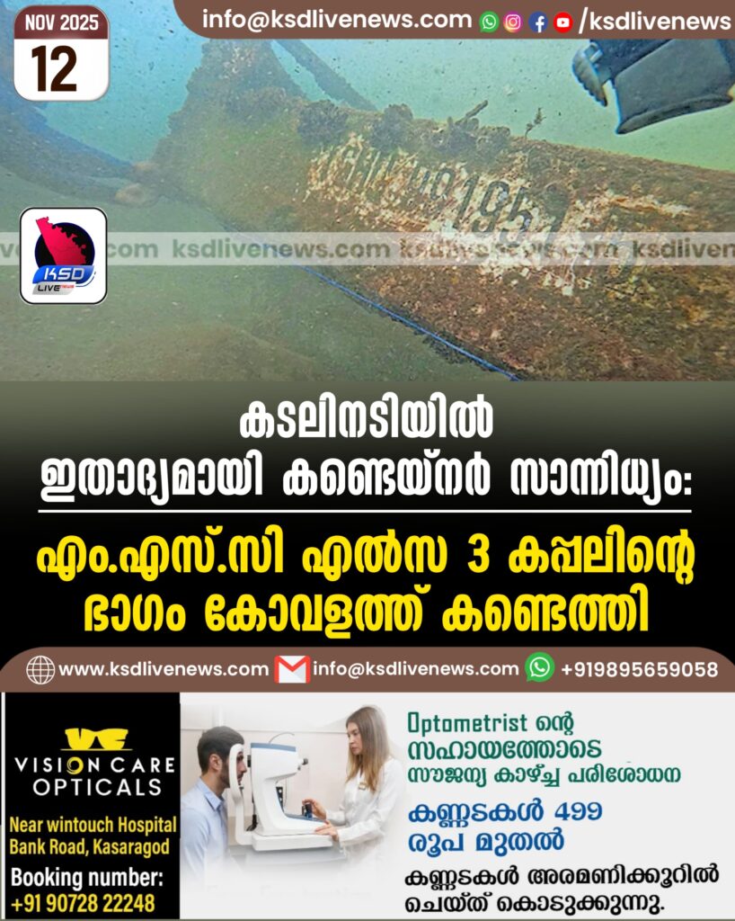 കടലിനടിയിൽ ഇതാദ്യമായി കണ്ടെയ്നർ സാന്നിധ്യം: എം.എസ്.സി എൽസ 3 കപ്പലിന്റെ ഭാഗം കോവളത്ത് കണ്ടെത്തി
