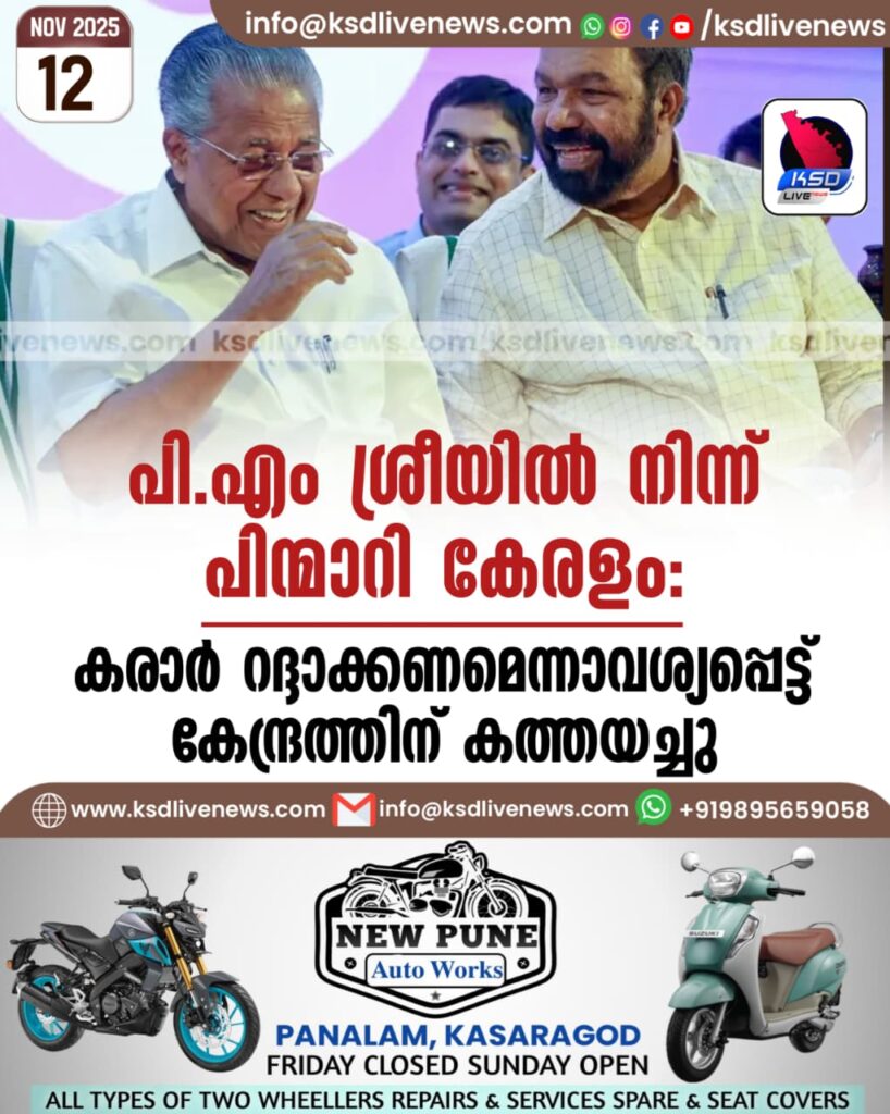പി എം ശ്രീയിൽനിന്ന് പിന്മാറി കേരളം: കരാര് റദ്ദാക്കണമെന്നാവശ്യപ്പെട്ട് കേന്ദ്രത്തിന് കത്തയച്ചു