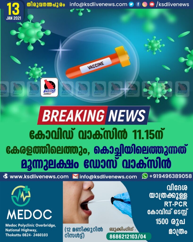 കോവിഡ് വാക്‌സിന്‍ 11.15ന് കേരളത്തിലെത്തും, കൊച്ചിയിലെത്തുന്നത് മൂന്നുലക്ഷം ഡോസ് വാക്‌സിന്‍