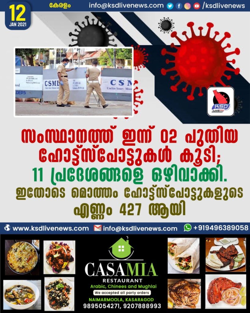 സംസ്ഥാനത്ത് ഇന്ന് 02 പുതിയ ഹോട്ട്സ്പോട്ടുകള് കൂടി; 11 പ്രദേശങ്ങളെ ഒഴിവാക്കി. ഇതോടെ മൊത്തം ഹോട്ട്സ്പോട്ടുകളുടെ എണ്ണം 427 ആയി.