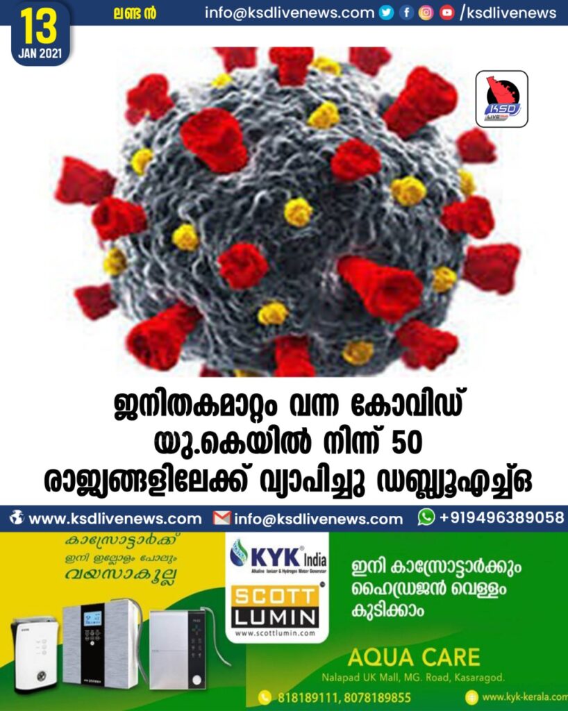 ജനിതകമാറ്റംവന്ന കോവിഡ് യു.കെയില് നിന്ന് 50 രാജ്യങ്ങളിലേക്ക് വ്യാപിച്ചു – ഡബ്ല്യൂഎച്ച്ഒ