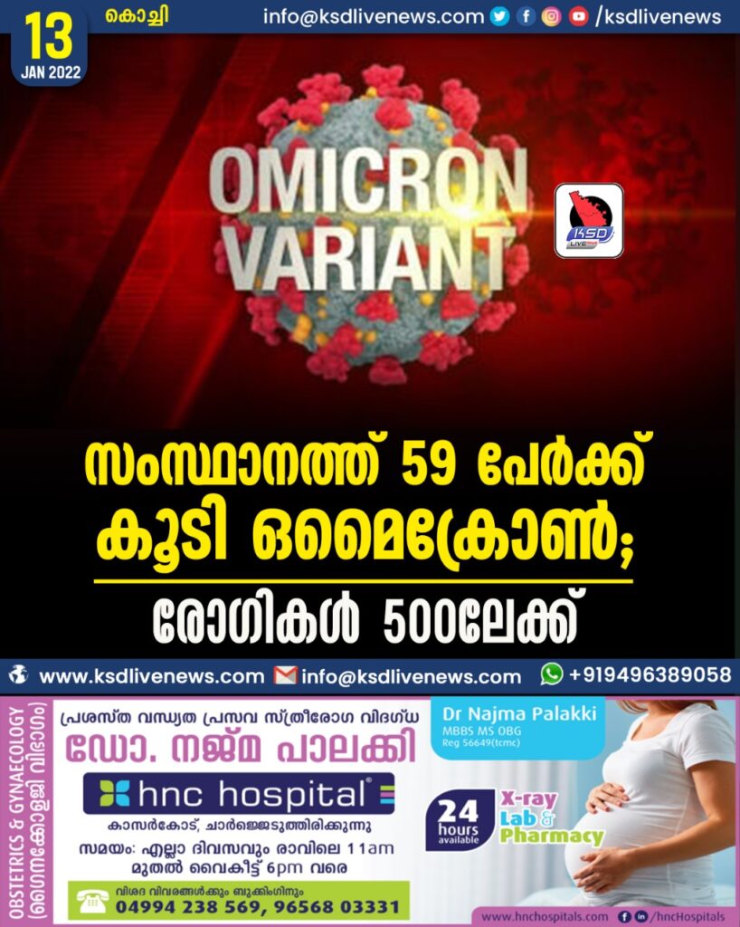 സംസ്ഥാനത്ത് 59 പേര്ക്ക് കൂടി ഒമൈക്രോണ്; രോഗികള് 500ലേക്ക്