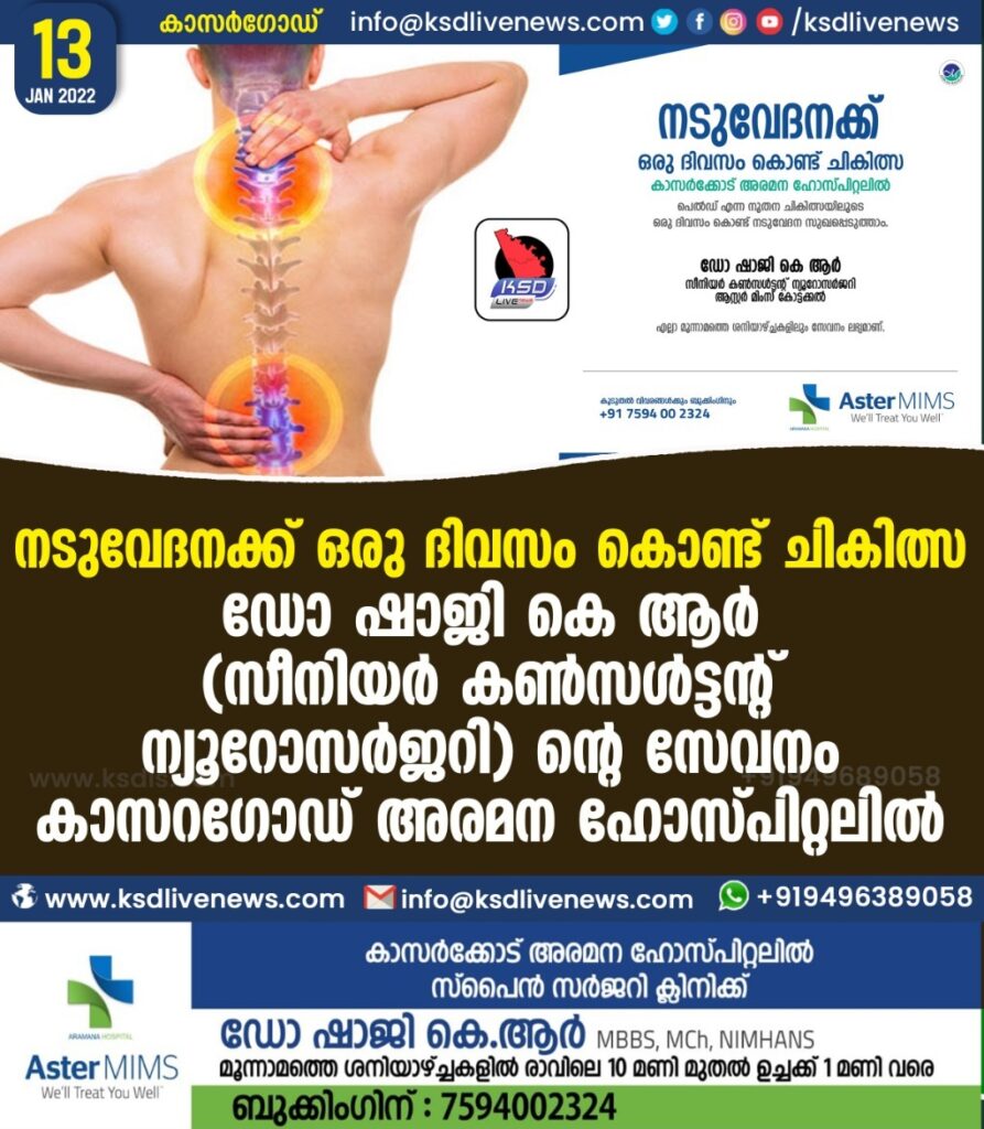 ഡോ. ഷാജി കെ ആർ (സീനിയർ കൺസൾട്ടന്റ് ന്യൂറോസർജറി) സേവനം 15/01/2022 ശനിയാഴ്ച 10 മണി മുതൽ 2 മണി കാസർക്കോട് അരമന ആശുപത്രിയിൽ