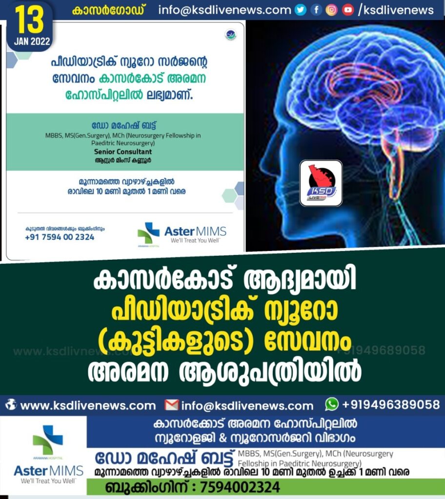 കാസര്കോഡ് അരമന ഹോസ്പിറ്റലില് ആസ്റ്റര് മിംസ് ഹോസ്പിറ്റല് കണ്ണൂരിലെ പ്രശസ്ത ന്യൂറോ & പീഡിയാട്രിക് ന്യൂറോ സര്ജന് ഡോകടര് മഹേഷ് ഭട്ടിന്റെ സേവനം 20/01/2021 വ്യാഴാഴ്ച രാവിലെ 10 മണി മുതല് 1 മണി വരെ ഉണ്ടായിരിക്കുന്നതാണ്. ബുക്കിങ്ങിന്