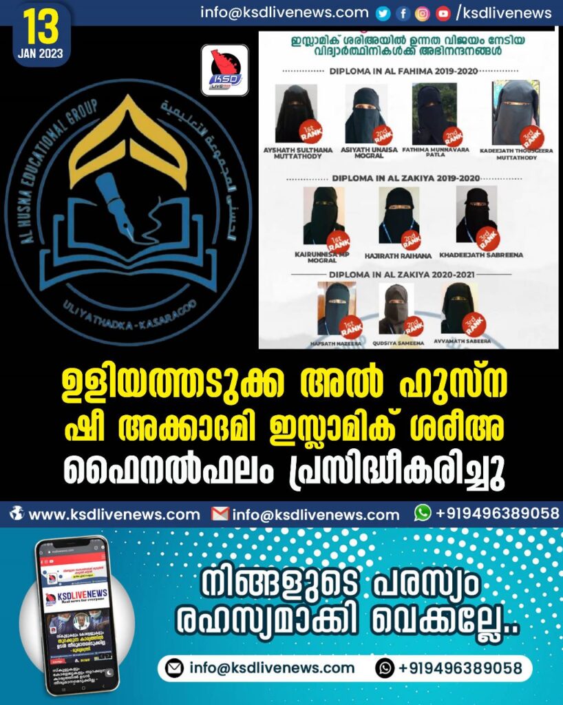 ഉളിയത്തടുക്ക അൽ ഹുസ്ന ഷീ അക്കാദമിയിൽ 2019 – 21 വർഷത്തെ മൂന്നു ബാച്ചുകളുടെ ഇസ്ലാമിക്‌ ശരീഅ ഫൈനൽ ഫലം പ്രസിദ്ധീകരിച്ചു.