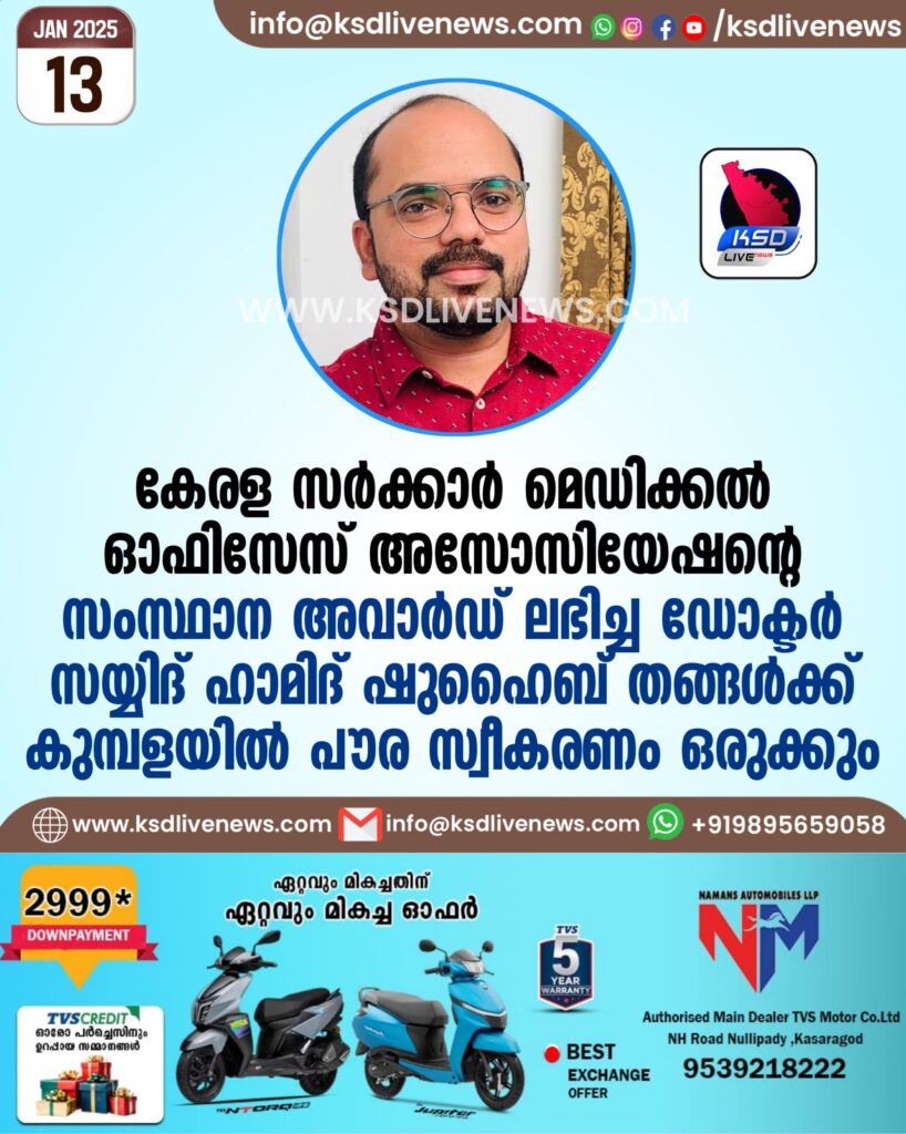 കേരള സർക്കാർ മെഡിക്കൽ ഓഫിസേസ് അസോസിയേഷന്റെ സംസ്ഥാന അവാർഡ് ലഭിച്ച ഡോക്ടർ സയ്യിദ് ഹാമിദ് ഷുഹൈബ് തങ്ങൾക്ക് കുമ്പള യിൽ പൗര സ്വീകരണം ഒരുക്കും