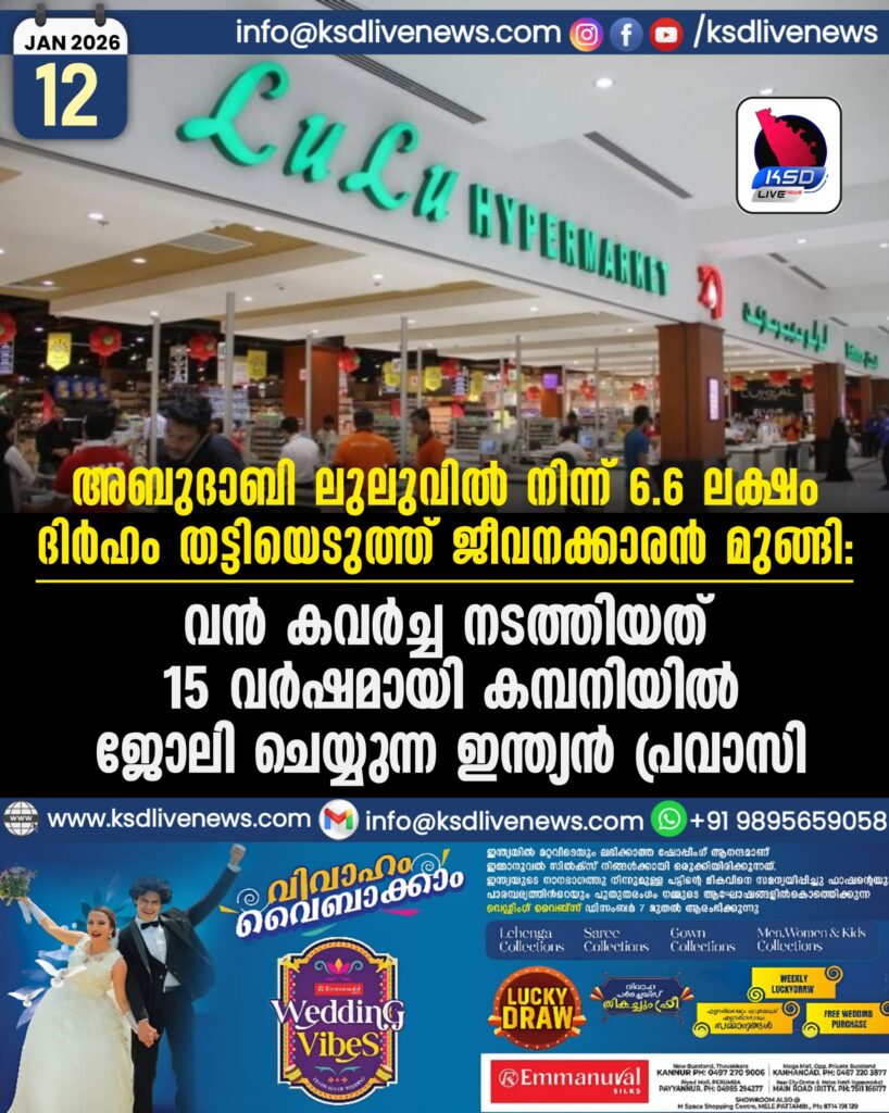 അബുദാബി ലുലുവിൽ നിന്ന് 6.6 ലക്ഷം ദിർഹം തട്ടിയെടുത്ത് ജീവനക്കാരൻ മുങ്ങി; വന് കവര്ച്ച നടത്തിയത് 15 വര്ഷമായി കമ്പനിയില് ജോലി ചെയ്യുന്ന ഇന്ത്യന് പ്രവാസി