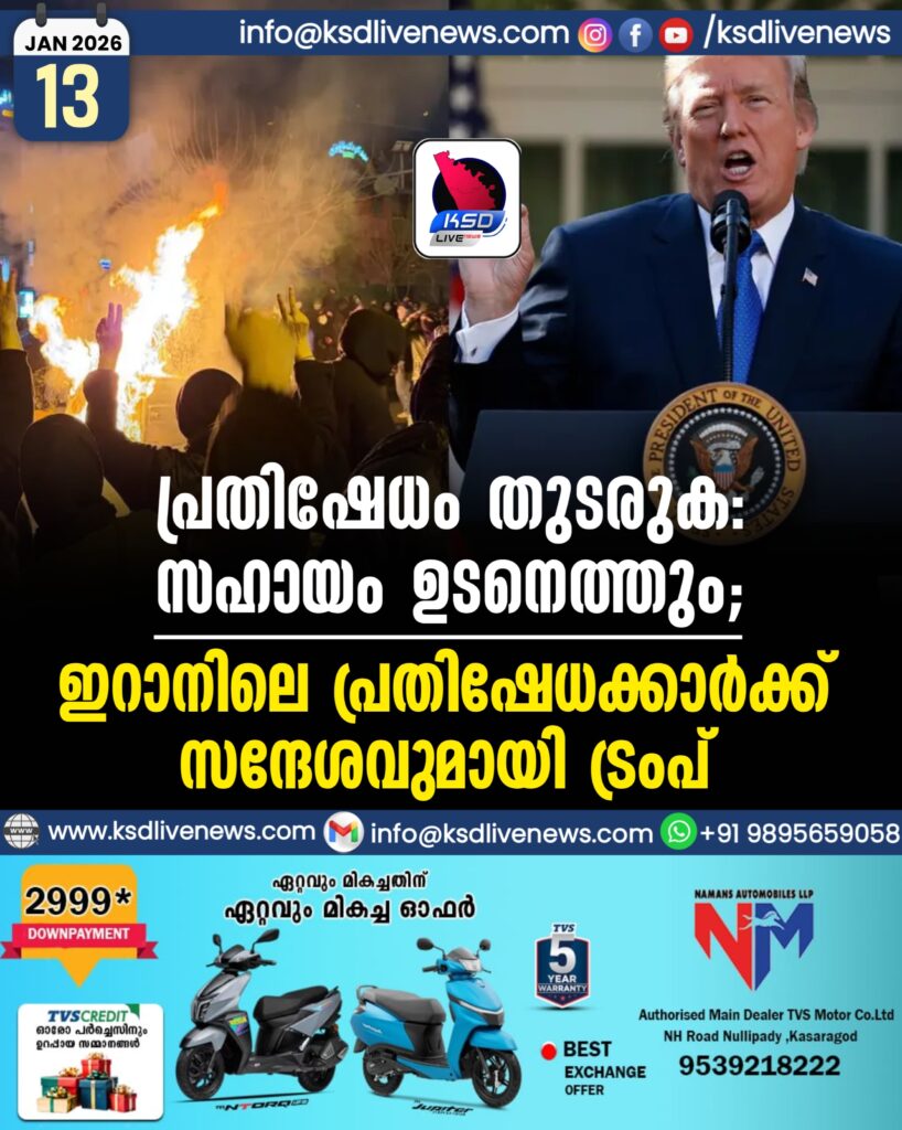 ‘ഇറാനിയൻ രാജ്യസ്നേഹികളേ, പ്രതിഷേധം തുടരുക – നിങ്ങളുടെ സ്ഥാപനങ്ങൾ ഏറ്റെടുക്കൂ! കൊലപാതകികളുടെയും അതിക്രമം ചെയ്യുന്നവരുടെയും പേരുകൾ ഓർത്തുവെക്കുക. അവർ വലിയ വില നൽകേണ്ടി വരും. പ്രതിഷേധക്കാരെ അർത്ഥശൂന്യമായി കൊലപ്പെടുത്തുന്നത് നിർത്തുന്നതുവരെ ഇറാനിയൻ ഉദ്യോഗസ്ഥരുമായുള്ള എല്ലാ കൂടിക്കാഴ്ചകളും ഞാൻ റദ്ദാക്കിയിട്ടുണ്ട്. സഹായം ഉടൻ എത്തും. MIGA! പ്രസിഡന്റ് ഡൊണാൾഡ് ജെ. ട്രംപ്.’ പ്രസിഡന്റ് ട്രൂത്ത് സോഷ്യലിൽ പോസ്റ്റ് ചെയ്തു.