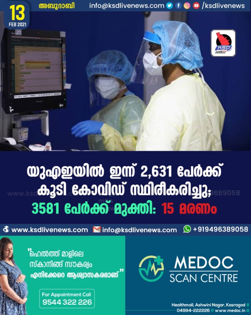 യുഎഇയില് ഇന്ന് 2,631 പേര്ക്ക് കൂടി കോവിഡ് സ്ഥിരീകരിച്ചു; 3581 പേർക്ക് മുക്തി: 15 മരണം