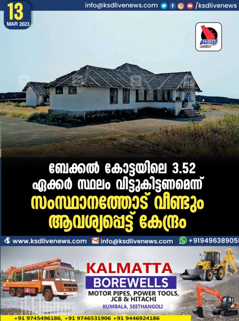 ബേക്കൽ കോട്ടയിലെ 3.52 ഏക്കർ സ്ഥലം വിട്ടുകിട്ടണമെന്ന് സംസ്ഥാനത്തോട് വീണ്ടും ആവശ്യപ്പെട്ട് കേന്ദ്രം