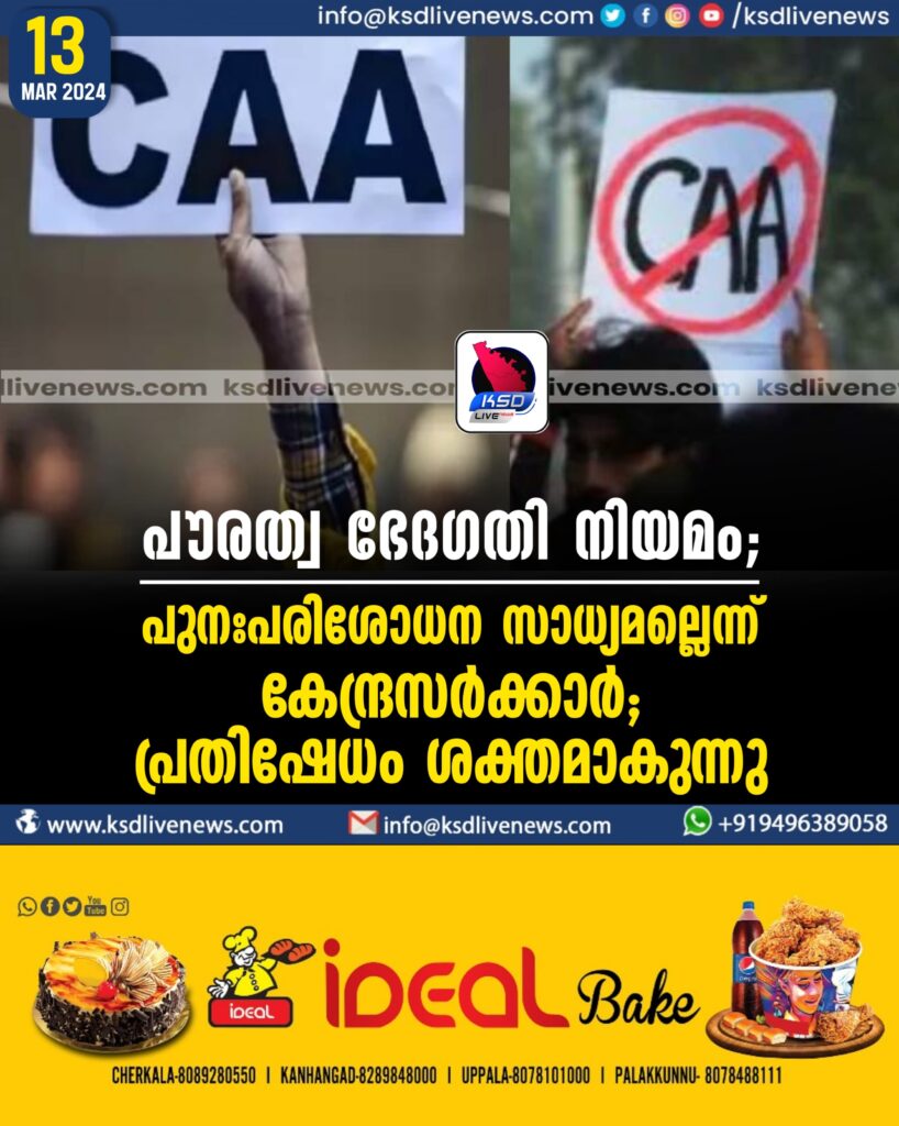 പൗരത്വ ഭേദഗതി നിയമം; പുനഃപരിശോധന സാധ്യമല്ലെന്ന് കേന്ദ്രസര്‍ക്കാര്‍; പ്രതിഷേധം ശക്തമാകുന്നു