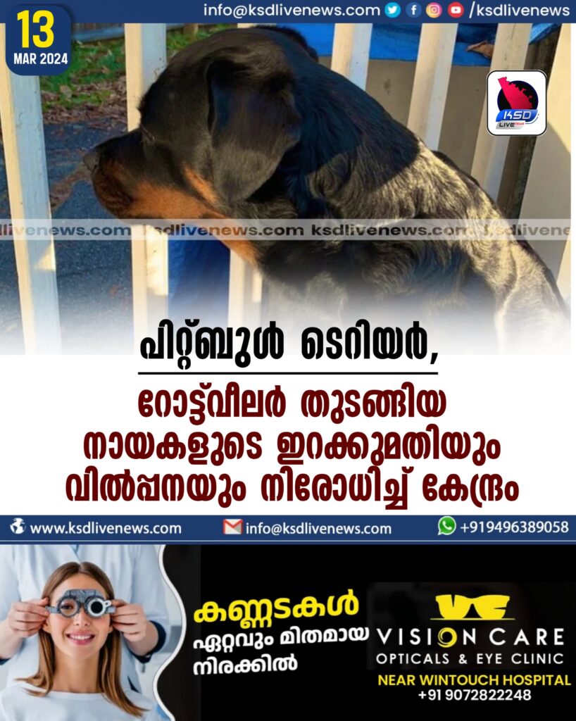 പിറ്റ്ബുൾ ടെറിയർ, റോട്ട്വീലര് തുടങ്ങിയ നായകളുടെ ഇറക്കുമതിയും വില്പ്പനയും നിരോധിച്ച് കേന്ദ്രം