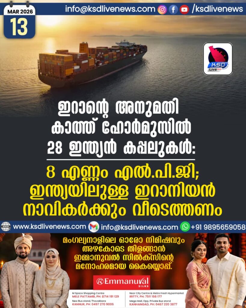 ഇന്ത്യയിലേക്ക് എത്താൻ ഹോർമുസ് കടലിടുക്കിന് സമീപം ഇറാന്റെ അനുമതി കാത്ത് കിടക്കുന്നത് 8 എൽപിജി കപ്പലുകൾ. ഇതിനു പുറമേ മറ്റ് 28 ഇന്ത്യൻ വാണിജ്യ കപ്പലുകളും അനുമതിക്കായി കാത്തുകിടക്കാൻ തുടങ്ങിയിട്ട് ദിവസങ്ങളായി. കഴിഞ്ഞ 4-5 ദിവസമായി ഇറാനിയൻ സൈന്യം ഇന്ത്യൻ കപ്പലുകളെയും ഹോർമുസ് വഴി പോകാൻ അനുവദിച്ചിട്ടില്ലെന്നാണ് വിവരം. ഇക്കാര്യം കേന്ദ്രം സ്ഥിരീകരിച്ചിട്ടില്ല.