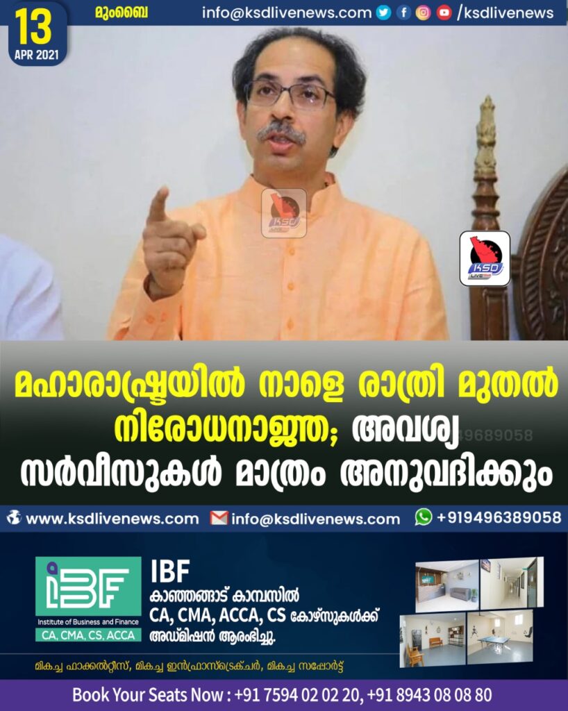 മഹാരാഷ്ട്രയില് നാളെ രാത്രി മുതല് നിരോധനാജ്ഞ; അവശ്യ സര്വീസുകള് മാത്രം അനുവദിക്കും