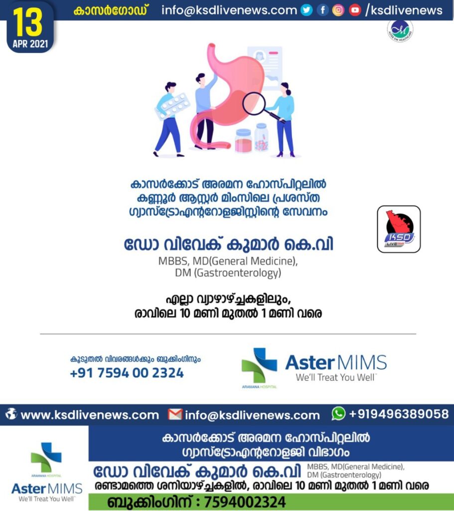 കണ്ണൂർ ആസ്റ്റർ മിംസ് ഹോസ്പിറ്റലിലെ പ്രശസ്ത ഗാസ്ട്രോ എൻ ട്രോളജി ഡോക്ടർ വിവേക് കുമാർ കെ വി യുടെ സേവനം കാസറഗോഡ് അരമന ഹോസ്പിറ്റലിൽ