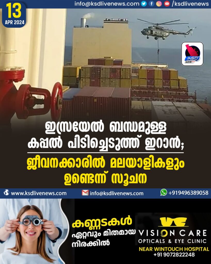 ഇസ്രയേൽ ബന്ധമുള്ള കപ്പൽ പിടിച്ചെടുത്ത് ഇറാൻ; ജീവനക്കാരിൽ മലയാളികളും ഉണ്ടെന്ന് സൂചന