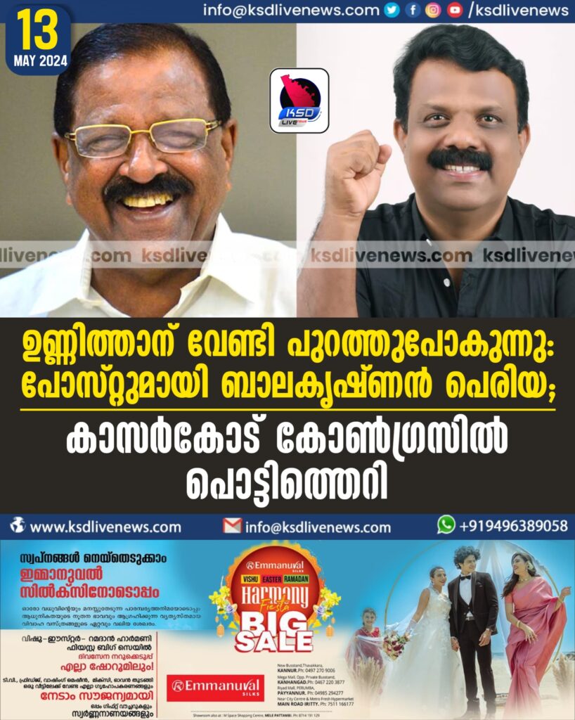 ഉണ്ണിത്താന് വേണ്ടി പുറത്തുപോകുന്നു: പോസ്റ്റുമായി ബാലകൃഷ്ണൻ പെരിയ; കാസർകോട് കോൺഗ്രസിൽ പൊട്ടിത്തെറി