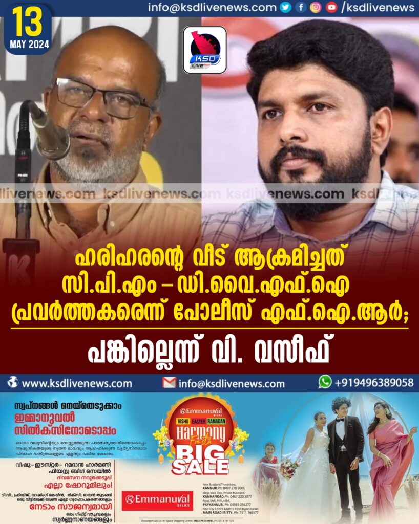 ഹരിഹരന്റെ വീട് ആക്രമിച്ചത് സി.പി.എം-ഡി.വൈ.എഫ്.ഐ പ്രവര്ത്തകരെന്ന് പോലീസ് എഫ്.ഐ.ആർ; പങ്കില്ലെന്ന് വി. വസീഫ്