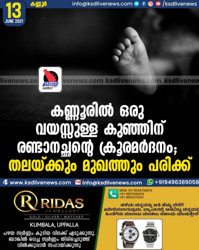 കണ്ണൂരില് ഒരു വയസ്സുള്ള കുഞ്ഞിന് രണ്ടാനച്ഛന്റെ ക്രൂരമര്ദനം; തലയ്ക്കും മുഖത്തും പരിക്ക്
