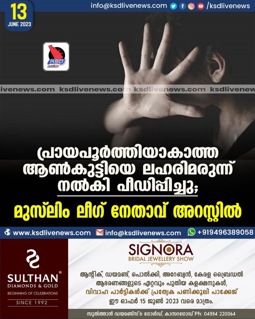 പ്രായപൂര്ത്തിയാകാത്ത ആണ്കുട്ടിയെ ലഹരിമരുന്ന് നല്കി പീഡിപ്പിച്ചു; ലീഗ് നേതാവ് അറസ്റ്റില്