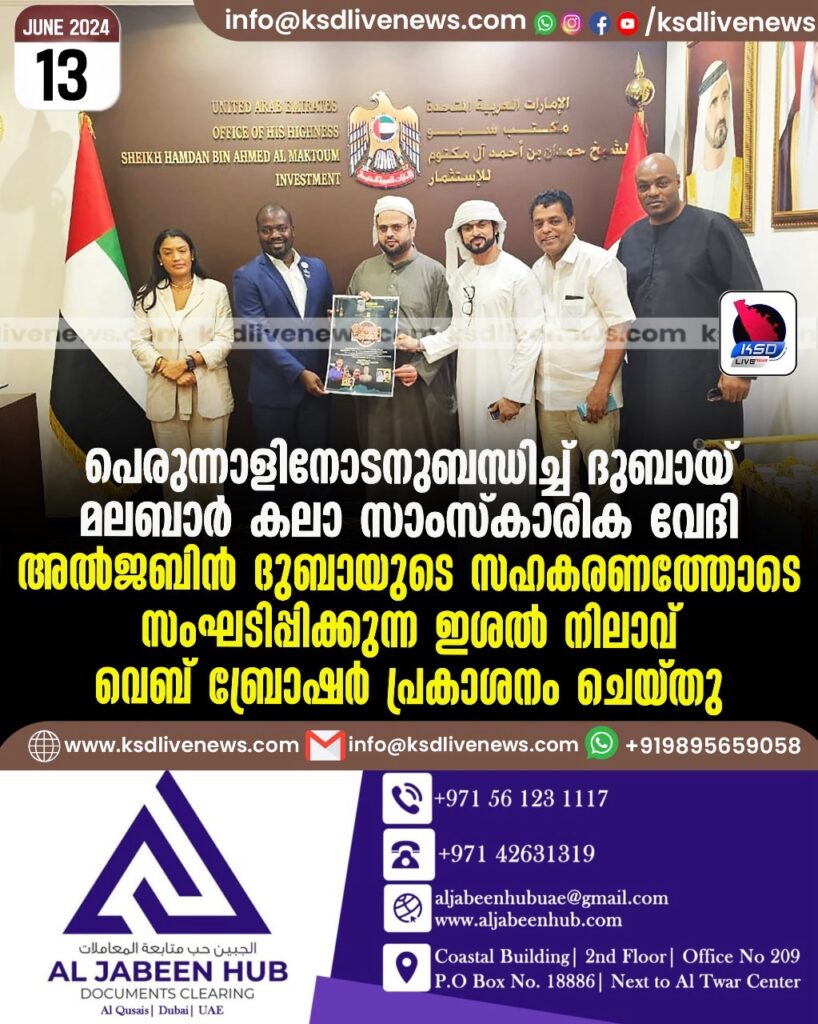 ദുബായ് : നാട്ടിലും മറുനാട്ടിലുമായി സാമൂഹിക സാംസ്കാരിക ജീവകാരുണ്യ കലാ കായിക രംഗത്ത് കാൽ നൂറ്റാണ്ടിൽ അധികമായി പ്രവർത്തിച്ച കൊണ്ടിരിക്കുന്ന ദുബായ് മലബാർ കലാസാംസ്കാരിക വേദി ബലി പെരുന്നാളിനോടനുബന്ധിച്ച് അൽ ജബിൻ ദുബായുടെ സഹകരണത്തോടെ ജൂൺ 22 നു ശനിയാഴ്ച വൈകുന്നേരം ദുബായിൽ സംഘടിപ്പിക്കുന്ന ഇശൽ നിലാവ് ബ്രോഷർ പ്രകാശനം ഈസ്‌ ഹൈനസ് ശൈഖ് ഹംദാൻ ബിൻ അഹമദ് അൽ മഖ്തും ഫൈനാസ് ഡയറക്ടർ മുഹമ്മദ്‌ അലി അങ്കോള ചേമ്പേഴ്‌സ് ഓഫ് കോമേഴ്‌സ് ആൻഡ് ഇന്റുസ്റ്ററി പ്രസിഡന്റ് ബറുലിയോ മുഹമ്മദ്‌ മാർട്ടിൻസ് നൽകി പ്രകാശനം ചെയ്തു.