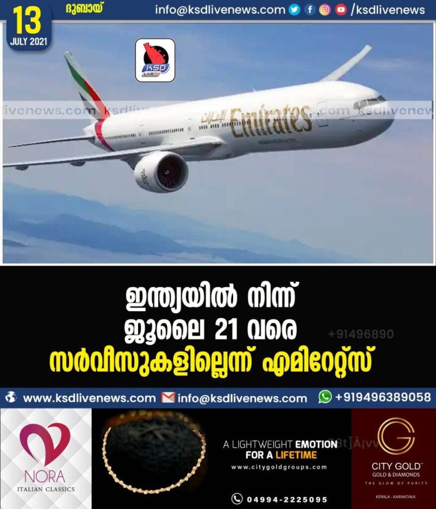 ഇന്ത്യയില് നിന്ന് ജൂലൈ 21 വരെ സര്വീസുകളില്ലെന്ന് എമിറേറ്റ്സ്
