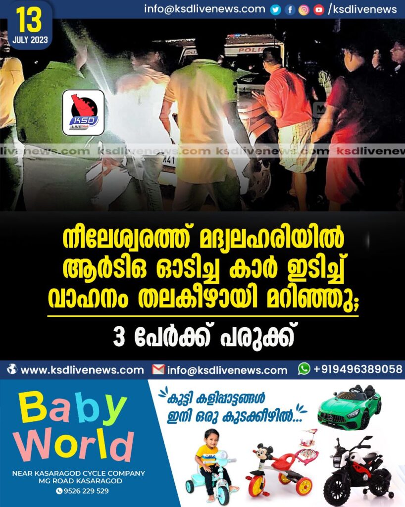നീലേശ്വരത്ത് മദ്യലഹരിയിൽ ആർടിഒ ഓടിച്ച കാർ ഇടിച്ച് വാഹനം തലകീഴായി മറിഞ്ഞു, 3 പേർക്ക് പരുക്ക്