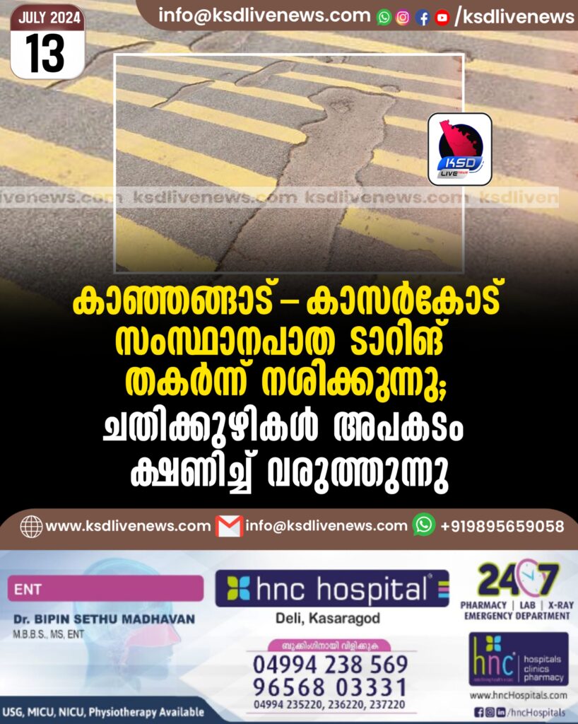 കാഞ്ഞങ്ങാട്-കാസർകോട് സംസ്ഥാനപാത ടാറിങ് തകർന്ന് നശിക്കുന്നു; ചതിക്കുഴികൾ അപകടം ക്ഷനിച്ച് വരുത്തുന്നു