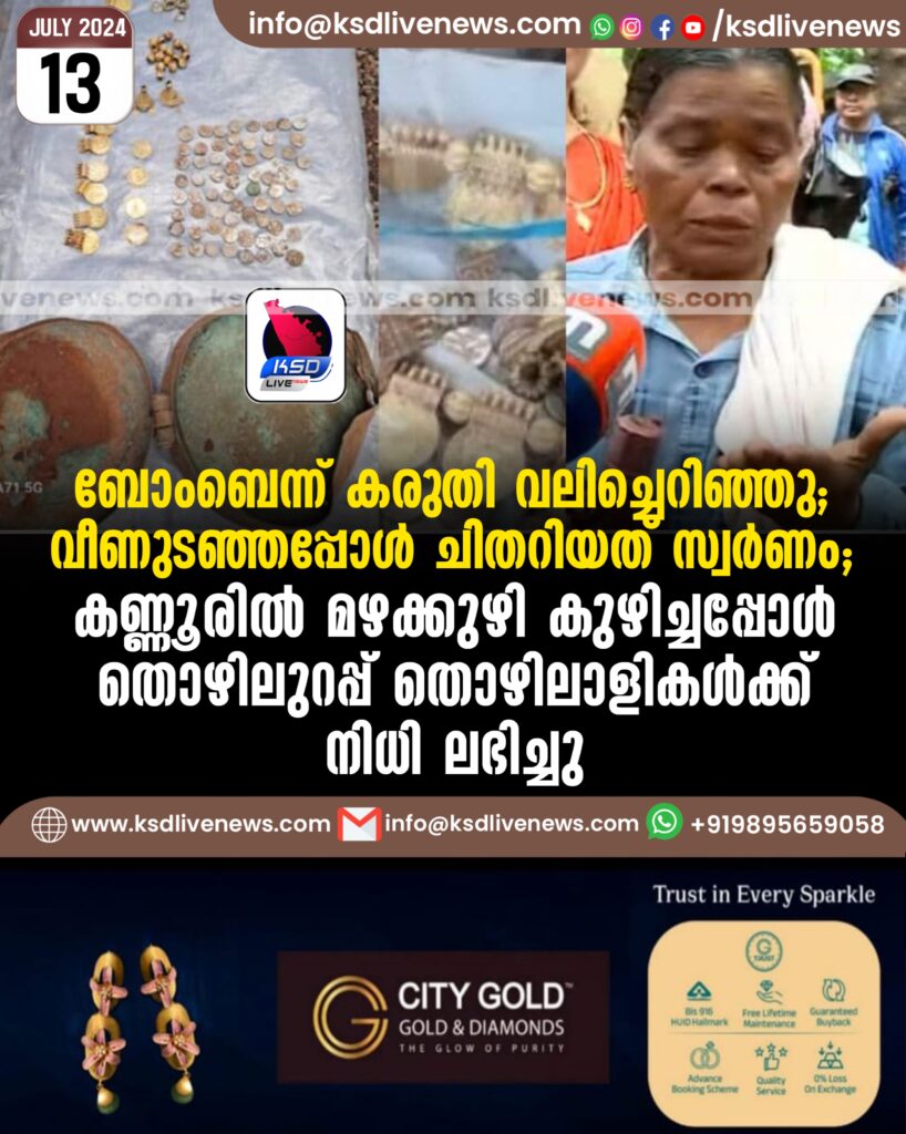 ബോംബെന്ന് കരുതി വലിച്ചെറിഞ്ഞു; വീണുടഞ്ഞപ്പോള് ചിതറിയത് സ്വര്ണം; കണ്ണൂരിൽ മഴക്കുഴി കുഴിച്ചപ്പോൾ തൊഴിലുറപ്പ് തൊഴിലാളികൾക്ക് നിധി ലഭിച്ചു