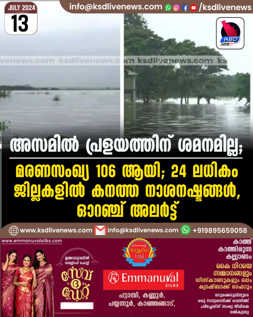 അസമില് പ്രളയത്തിന് ശമനമില്ല; മരണസംഖ്യ 106 ആയി; 24 ലധികം ജില്ലകളില് കനത്ത നാശനഷ്ടങ്ങള്, ഓറഞ്ച് അലര്ട്ട്