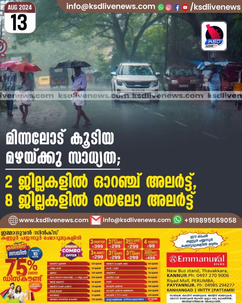 മിന്നലോട് കൂടിയ മഴയ്‌ക്കു സാധ്യത; 2 ജില്ലകളിൽ‌ ഓറഞ്ച് അലർട്ട്, 8 ജില്ലകളിൽ യെലോ അലർട്ട്