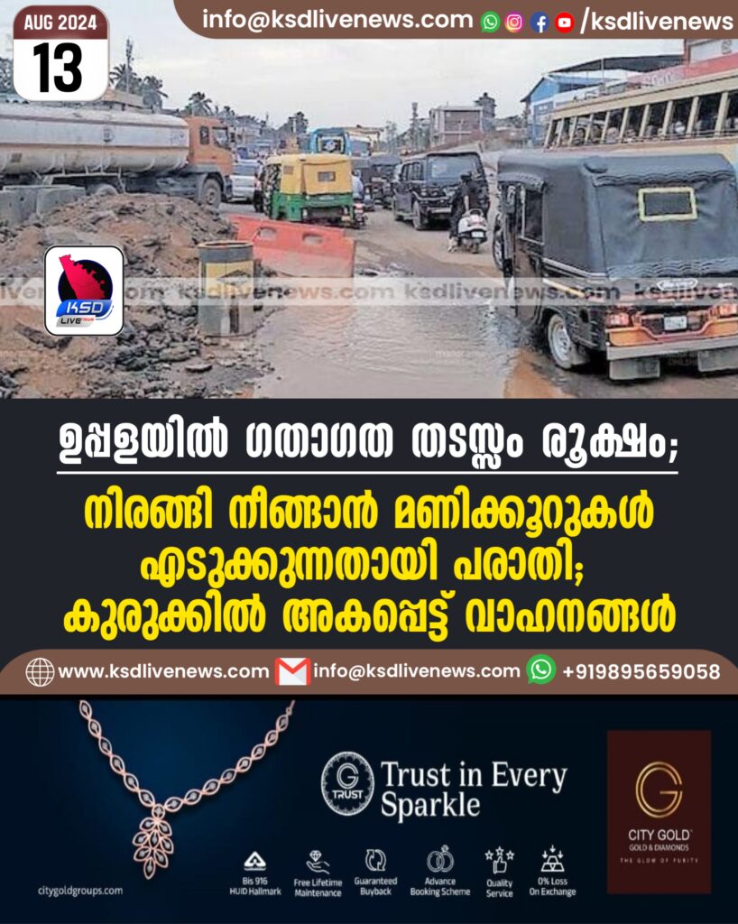 ഉപ്പളയിൽ ഗതാഗത തടസ്സം രൂക്ഷം; നിരങ്ങി നീങ്ങാൻ മണിക്കൂറുകൾ എടുക്കുന്നതായി പരാതി; കുരുക്കിൽ അകപ്പെട്ട് വാഹനങ്ങൾ