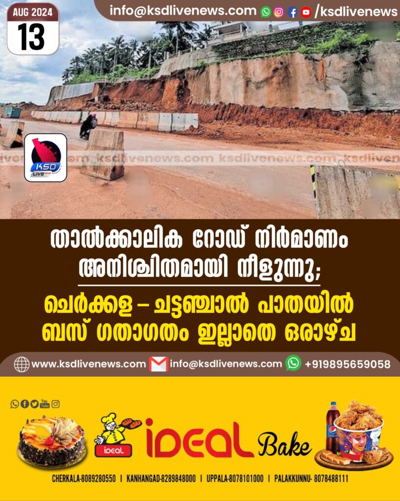 ചെർക്കള ∙ ഒരാഴ്ചയായി ബസ് ഗതാഗതം നിലച്ച ചെർക്കള-ചട്ടഞ്ചാൽ ദേശീയ പാതയിൽ താൽക്കാലിക റോഡ് നിർമാണ പ്രവൃത്തി പുനരാരംഭിക്കാൻ രണ്ടാഴ്ച കൂടി വേണ്ടിവരും.ബേവിഞ്ച കുണ്ടടുക്കത്ത് റോഡിന്റെ വിള്ളൽ കണ്ട സ്ഥലത്ത് വലതു ഭാഗത്ത് താൽക്കാലിക റോഡ് ഉണ്ടാക്കുന്നതിന് മണ്ണിടിക്കുന്നതിനിടെ ഇടിഞ്ഞ ഭാഗത്ത് വീടുകളുടെ ഉൾപ്പെടെ സുരക്ഷിതത്വം ഉറപ്പു വരുത്തിയായിരിക്കും താൽക്കാലിക റോഡിന്റെ നിർമാണ പ്രവൃത്തി. .