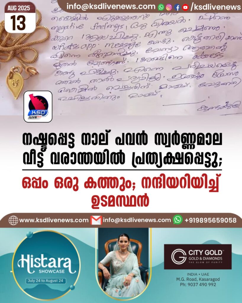 കത്തില്‍ മാല കൈവശം വെച്ച സമയത്ത് നെഗറ്റീവ് ഫീല്‍ ഉണ്ടായെന്നും, ഇത്രയും ദിവസം മാല കൈവശം വെച്ചതില്‍ മാപ്പ് ചോദിക്കുന്നുവെന്നും പറയുന്നു. മാല തിരികെ ലഭിച്ച വിവരം ദാമോദരൻ തന്നെയാണ് പങ്കുവെച്ചത്. മാല നഷ്ടപ്പെട്ട വിവരം ഷെയര്‍ ചെയ്ത എല്ലാ സുമനസ്സുകള്‍ക്കും നന്ദി അറിയിക്കുകയും ചെയ്തിട്ടുണ്ട്. അതേസമയം, നാല് പവന്‍ സ്വര്‍ണം ഉടമയുടെ വീട്ടിലെത്തിച്ച, കത്ത് എഴുതിയ അജ്ഞാതന്‍ ആര് എന്നാണ് നാട്ടുകാര്‍ ചോദിക്കുന്നത്.