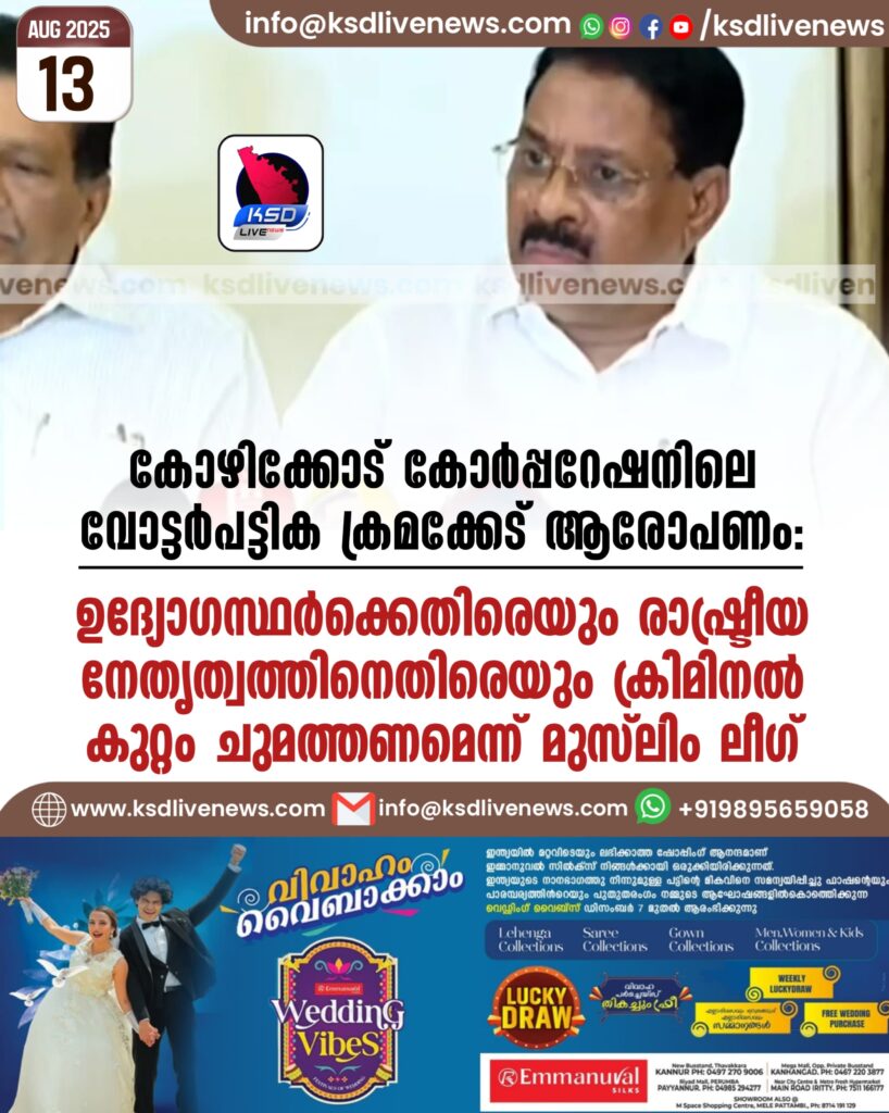 കോഴിക്കോട് കോർപ്പറേഷനിലെ വോട്ടർപട്ടിക ക്രമക്കേട് ആരോപണം: ഉദ്യോഗസ്ഥർക്കെതിരെയും രാഷ്ട്രീയ നേതൃത്വത്തിനെതിരെയും ക്രിമിനൽ കുറ്റം ചുമത്തണമെന്ന് മുസ്‌ലിം ലീഗ്