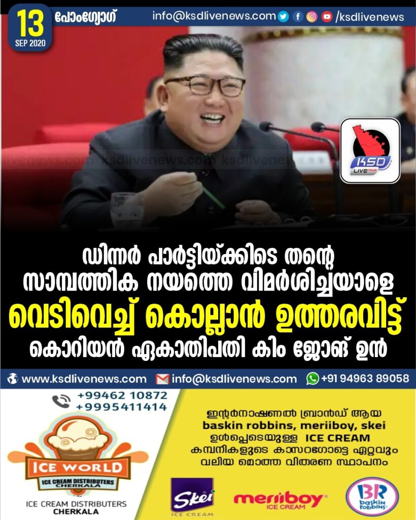 ഡിന്നർ പാർട്ടിയ്ക്കിടെ തന്റെ സാമ്പത്തിക നയത്തെ വിമർശിച്ചയാളെ വെടിവെച്ച് കൊല്ലാൻ ഉത്തരവിട്ട് കൊറിയൻ ഏകാതിപതി കിം ജോങ് ഉൻ