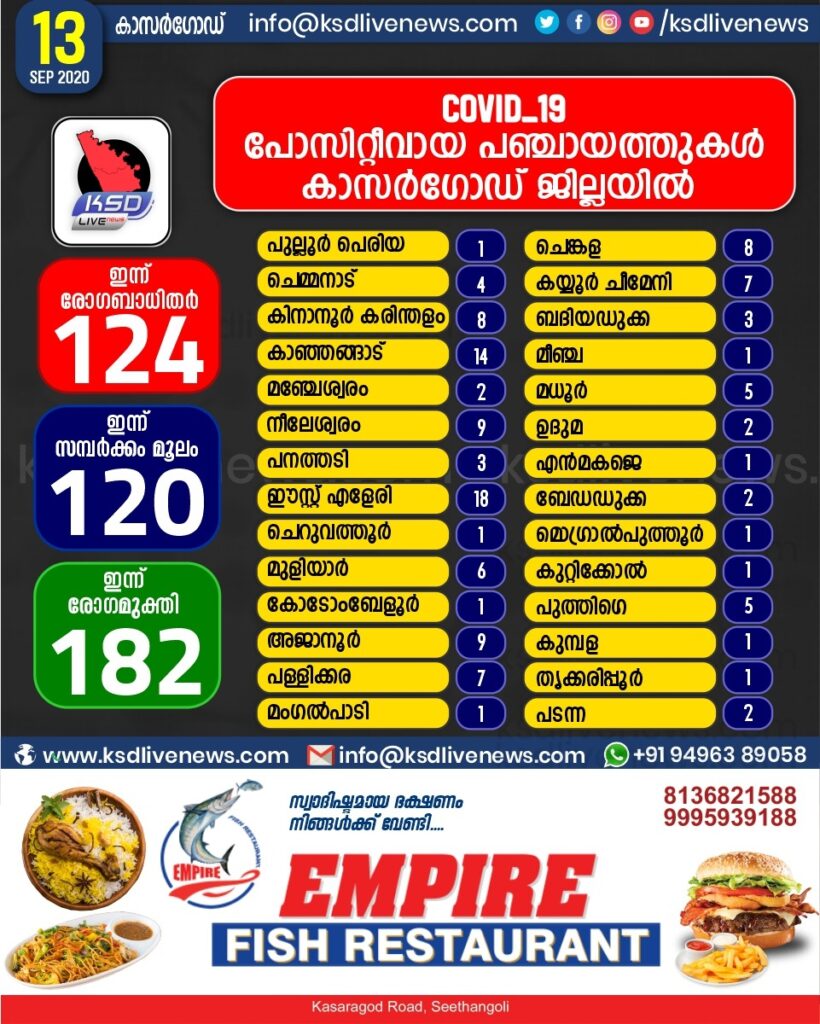 കാസർഗോഡ് ജില്ലയിൽ ഇന്ന് കോവിഡ് പോസിറ്റീവായവരുടെ പഞ്ചായത്ത് തിരിച്ചുള്ള സ്ഥിതി വിവരങ്ങൾ