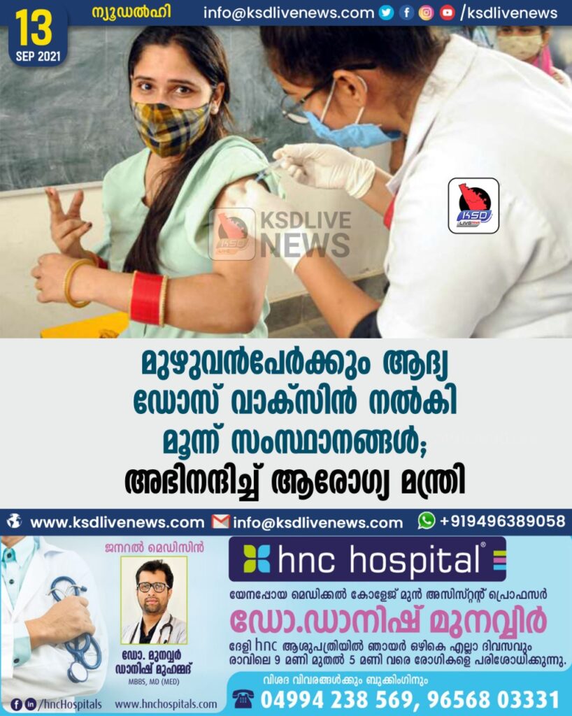 മുഴുവന്‍പേര്‍ക്കും ആദ്യ ഡോസ് വാക്‌സിന്‍ നല്‍കി മൂന്ന് സംസ്ഥാനങ്ങള്‍ ; അഭിനന്ദിച്ച് ആരോഗ്യ മന്ത്രി