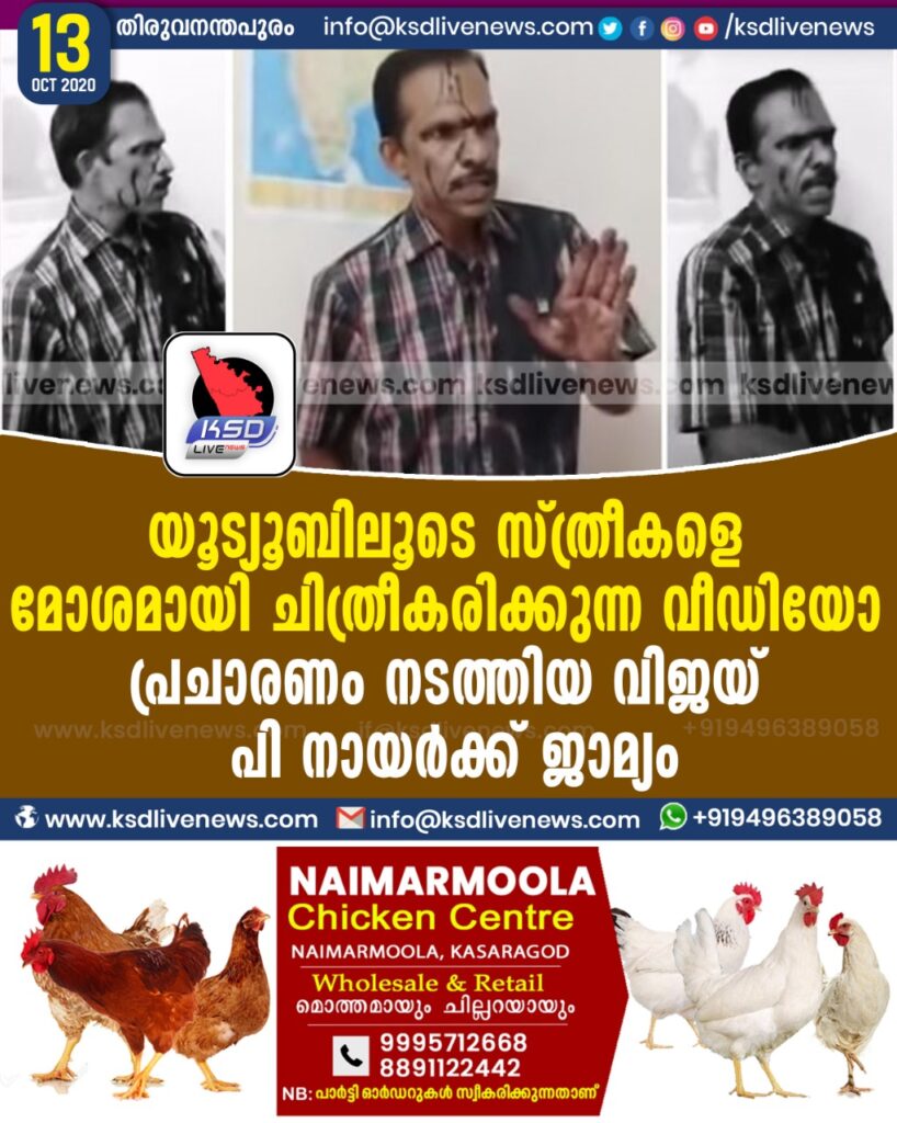 യൂട്യൂബിലൂടെ സ്ത്രീകളെ മോശമായി ചിത്രീകരിക്കുന്ന വീഡിയോ പ്രചാരണം നടത്തിയ വിജയ് പി നായർക്ക് ജാമ്യം