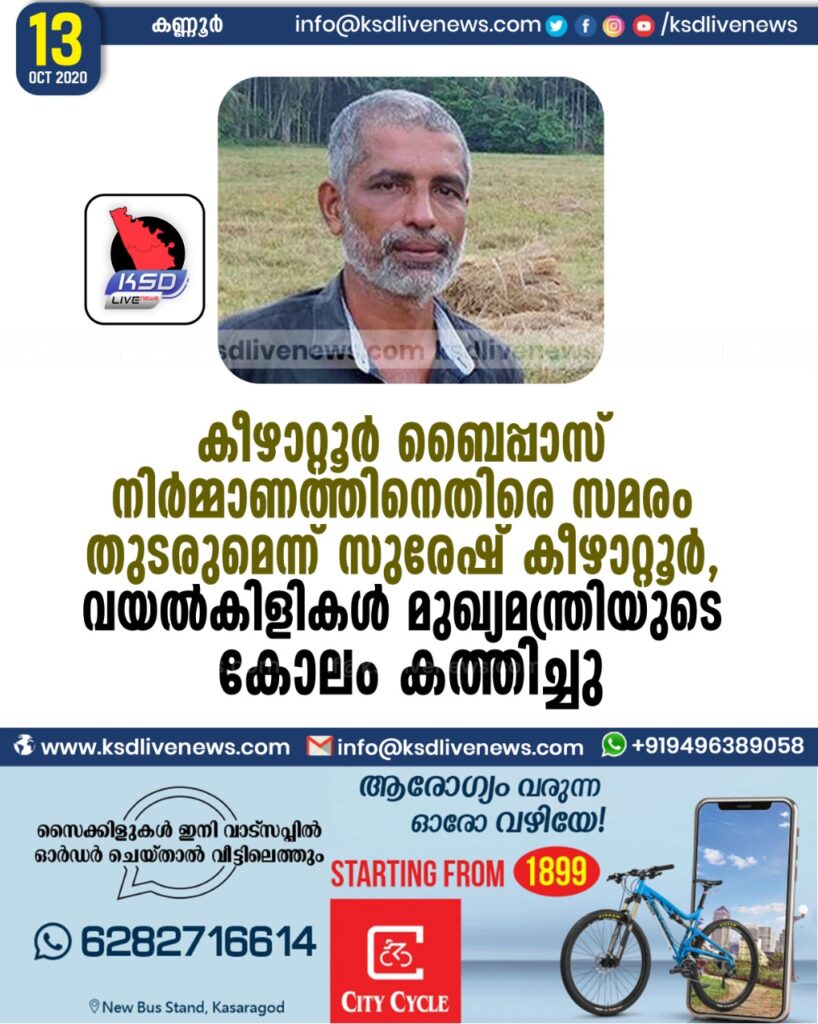 കീഴാറ്റൂർ ബൈപ്പാസ് നിർമ്മാണത്തിനെതിരെ സമരം തുടരുമെന്ന് സുരേഷ് കീഴാറ്റൂർ, വയൽകിളികൾ മുഖ്യമന്ത്രിയുടെ കോലം കത്തിച്ചു