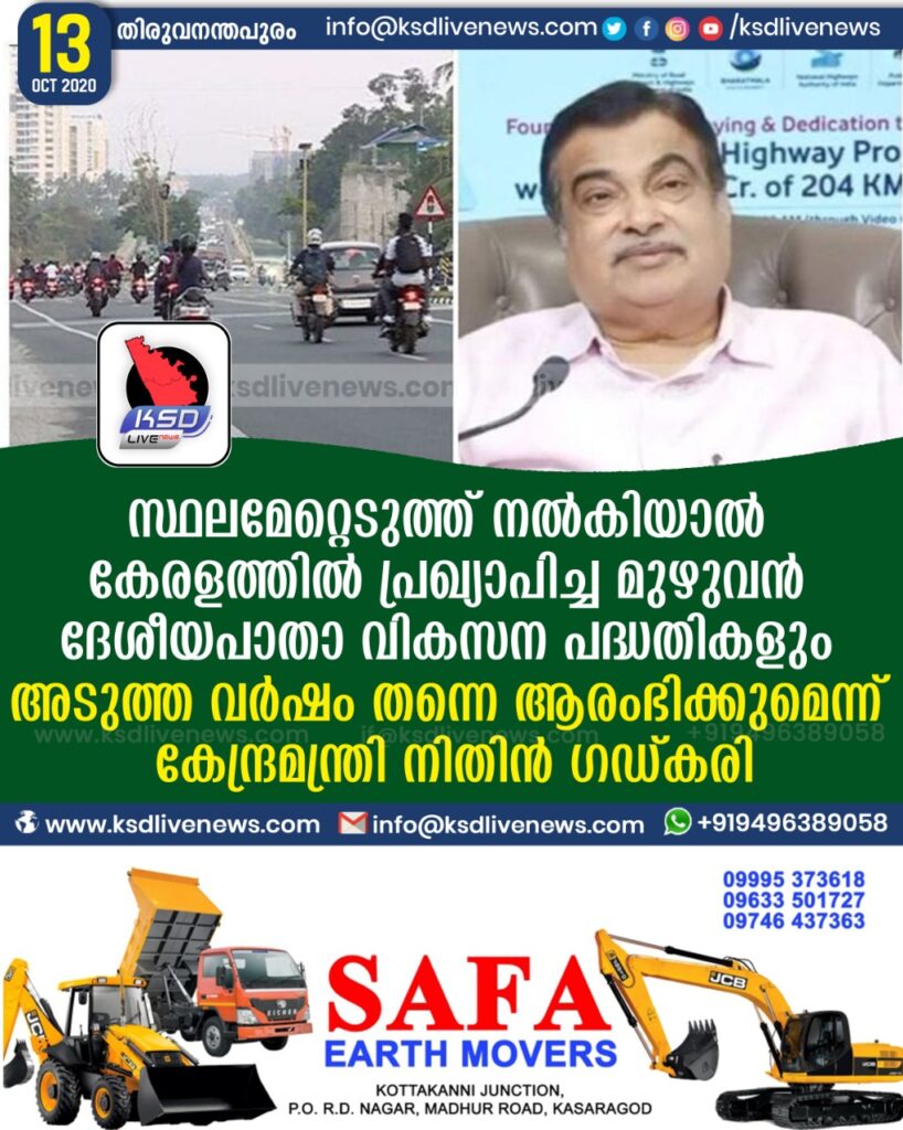 സ്ഥലമേറ്റെടുത്ത് നൽകിയാൽ കേരളത്തിൽ പ്രഖ്യാപിച്ച മുഴുവൻ ദേശീയപാതാ വികസന പദ്ധതികളും അടുത്ത വർഷം തന്നെ ആരംഭിക്കുമെന്ന് കേന്ദ്രമന്ത്രി നിതിൻ ഗഡ്കരി