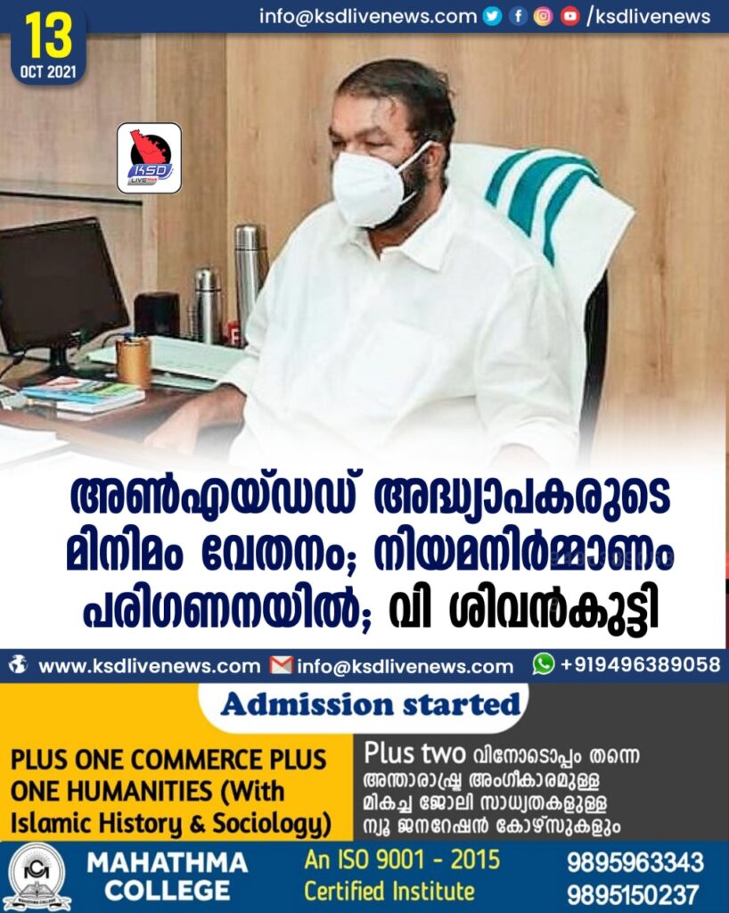 സംസ്ഥാനത്തെ അംഗീകാരമുള്ള അണ്എയ്ഡഡ് വിദ്യാഭ്യാസ സ്ഥാപനങ്ങളിലെ അദ്ധ്യാപകര്ക്ക് മിനിമം വേതനം ഉറപ്പ് വരുത്താൻ നിയമ നിര്മ്മാണം നടത്തുന്നകാര്യം സര്ക്കാർ പരിഗണനയിലെന്ന് മന്ത്രി വി ശിവൻകുട്ടി.